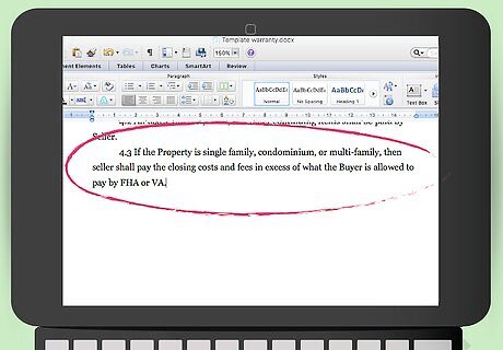 Require the seller to pay closing costs. A seller might need to contribute to closing costs if the buyer has an FHA or VA loan. You should include a provision stating that the seller will pay whatever excess closing costs are not covered by the buyer’s loan. A sample provision might read: “If the Property is single family, condominium, or multi-family, then seller shall pay the closing costs and fees in excess of what the Buyer is allowed to pay by FHA or VA.”