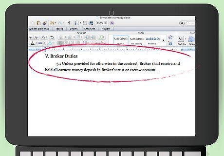 State that the broker will hold the earnest money. You can decide to have the broker accept the earnest money and deposit it into an escrow or trust account. If so, then you should include a clause giving the broker this power. You could write, “Unless provided for otherwise in the contract, Broker shall receive and hold all earnest money deposit in Broker’s trust or escrow account.”