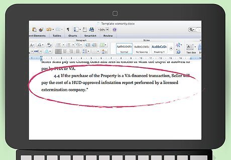 Require the seller to pay for an infestation report. If the buyer’s financing is from Veteran’s Affairs, then the buyer will need to pay for a HUD-approved infestation report. List this requirement in the broker listing agreement. For example, you could write: “If the purchase of the Property is a VA-financed transaction, Seller will pay the cost of a HUD-approved infestation report performed by a licensed extermination company.”
