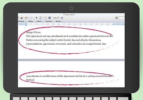 Include a merger clause. Sometimes a party will claim that the written contract doesn’t contain the entire agreement. Instead, they will claim that there were prior oral or written agreements. You can prevent either side from making these arguments by including a merger clause. This is a standard merger clause: “This Agreement and any attachments to it constitute the entire agreement between the Parties concerning the subject matter hereof. Any and all prior discussions, representations, agreements, covenants, and warranties are merged herein. Any amendments or modifications of this Agreement shall be in a writing executed by both Parties.”