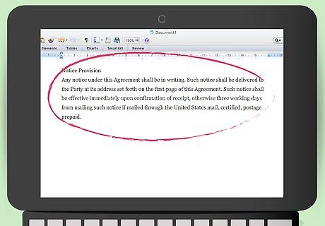 Insert a notice provision. If the parties need to contact each other to waive their rights or complain about the goods, then they should do so in writing. Your notice provision will explain how each side can give notice. This is a pretty standard notice provision: “Any notice under this Agreement shall be in writing. Such notice shall be delivered to the Party at its address set forth on the first page of this Agreement. Such notice shall be effective immediately upon confirmation of receipt, otherwise three working days from mailing such notice if mailed through the United States mail, certified, postage prepaid.” You can also allow notice to be provided by email or by fax, if you want. Make sure to include the email address or fax number that notices should be sent to.
