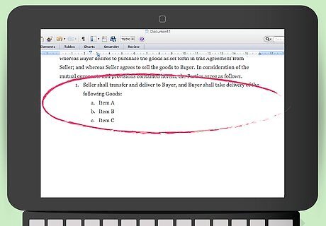 Identify the goods. You need to describe the goods in sufficient detail that the parties can identify them. Also include the quantity of goods you are selling. You could write: “Seller shall transfer and deliver to Buyer, and Buyer shall take delivery of the following Goods.” And then include a description of the goods. If you are selling a lot of different things, then you can simply attach a list as an attachment. Make sure the contract says something like, “See Attachment A” or “See invoice dated” and then give the date of the invoice.