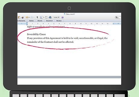 Add a severability clause. In some situations, if a judge finds one provision in a contract illegal, then the judge could void the entire contract. Contracts nowadays anticipate this problem by including a severability clause. This clause states that if one portion of the contract is deemed illegal, the rest of the contract remains in force. Your severability clause could read: “If any provision of this Agreement is held to be void, unenforceable, or illegal, the remainder of the Contract shall not be affected.”