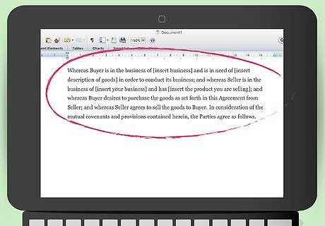 Include your recitals. Recitals are the “whereas” clauses that describe each party’s purpose in entering the contract. These are usually written as sentence fragments. You can include these recitals: “Whereas Buyer is in the business of [insert business] and is in need of [insert description of goods] in order to conduct its business; and whereas Seller is in the business of [insert your business] and has [insert the product you are selling]; and whereas Buyer desires to purchase the goods as set forth in this Agreement from Seller; and whereas Seller agrees to sell the goods to Buyer. In consideration of the mutual covenants and provisions contained herein, the Parties agree as follows.”