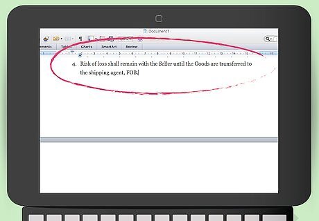 Assign risk of loss. Accidents happen when goods are delivered. A truck might crash on the way to delivery, or someone might make off with the goods. You have to assign who will bear the loss. If the seller holds title to the goods until delivery, then the seller will bear the risk of any loss during delivery. However, if the buyer is assigned title as soon as the goods leave the warehouse, then the buyer assumes the risk of any loss during delivery. A sample provision could read: “Risk of loss shall remain with the Seller until the Goods are transferred to the shipping agent, FOB.” With this clause, the buyer takes on the risk of loss when the goods are deposited with whoever is delivering the goods for the seller.