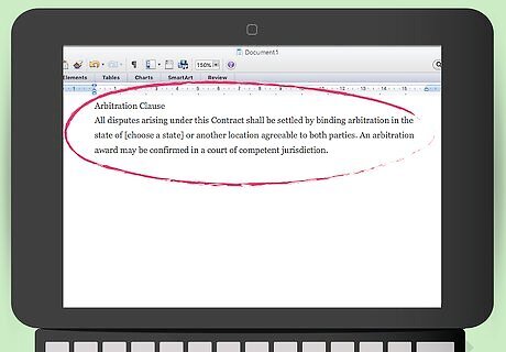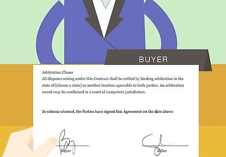 Add an arbitration clause. If you are sued, then you might want to resolve the dispute outside of court. For example, you could arbitrate the dispute. Arbitration is like a trial, except you present your case to one or more arbitrators instead of to a judge. Unlike a trial, arbitration is private. It can also be faster and cheaper than a lawsuit. If you want to arbitrate disputes, then you should include an arbitration clause in your sales agreement. The arbitration clause might read: “All disputes arising under this Contract shall be settled by binding arbitration in the state of [choose a state] or another location agreeable to both parties. An arbitration award may be confirmed in a court of competent jurisdiction.”