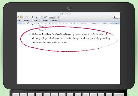 State the time of delivery. You should insert the date and the location of the delivery. You might also want to give the buyer the right to change the delivery date by given prior written notice to the seller. A sample clause might read: “Seller shall deliver the Goods to Buyer by [insert date] to [add location of delivery]. Buyer shall have the right to change the delivery date by providing written notice 10 days in advance.”