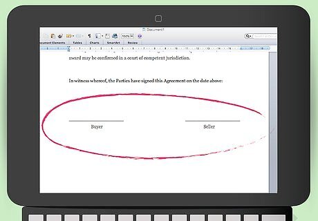 Add signature blocks. At the bottom of the agreement you need to add lines for both the buyer and seller (or their agents/representatives) to sign. You might also want to have the contract notarized. If so, you will have to insert a notary block applicable to your state.