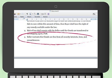 Insert warranties. A warranty is a legal promise to stand behind a product. In the sales context, sellers often warrant that the goods are fit to be used as represented and that they are free from any defect or incumbrance. As the seller, you often want to limit your warranties because you can be sued if your goods don’t live up to your promises. You might want to warrant that the goods are free from any other legal claim, such as a lien. You could write: “Seller warrants that Goods are free from all security interests, liens, and encumbrances.” Alternately, you might want to disclaim all warranties. By doing so, you can limit your exposure as the seller to any lawsuits if the goods are defective. For example, you could write: “Seller hereby excludes all express or implied warranties, including the warranty of merchantability. There are no warranties that extend beyond the description on the face of this contract. There are no representations between the Parties other than those expressly set forth in this Contract.”
