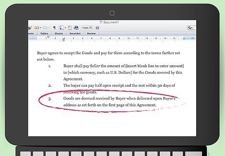 Explain when goods are received. Sometimes disputes can break out when a buyer claims not to have received goods. Your contract should identify what qualifies as “receipt” of goods. For example, you could write: “Goods are deemed received by Buyer when delivered upon Buyer’s address as set forth on the first page of this Agreement.”