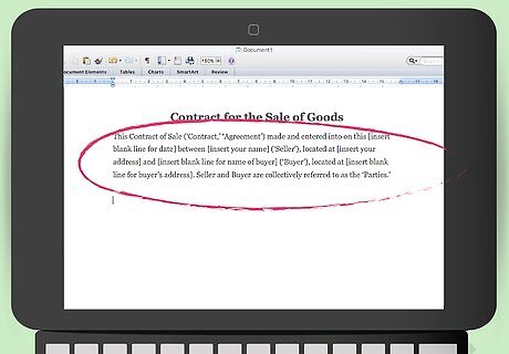 Identify the parties to the contract. In the first paragraph, you should identify the seller and the buyer. Make sure to include their business addresses, as this information will help identify them. For example, you could write, “This Contract of Sale (‘Contract,’ ‘Agreement’) made and entered into on this [insert blank line for date] between [insert your name] (‘Seller’), located at [insert your address] and [insert blank line for name of buyer] (‘Buyer’), located at [insert blank line for buyer’s address]. Seller and Buyer are collectively referred to as the ‘Parties.’”