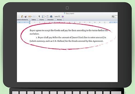 Insert a provision about payment. The buyer needs to agree to accept the goods and pay for them, otherwise you don’t have a contract. Make sure to include a provision like the following: “Buyer agrees to accept the Goods and pay for them according to the terms further set out below.” Also state how much the buyer agrees to pay: “Buyer shall pay Seller the amount of [insert blank line to enter amount] in [which currency, such as U.S. Dollars] for the Goods covered by this Agreement.”