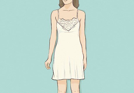 Put on a chemise. Though your undergarments don't necessarily have to be authentic, a chemise is necessary to keep your corset from digging painfully into your skin. An authentic chemise would be similar to today's short-sleeved cotton blouse. If you're in a pinch for time, don't like the feel of chemises, or simply don't want to fork over an extra thirty dollars to be "authentic", you can use a short-sleeved white T-shirt or white tank top instead. Remember, since you're wearing a corset, you won't need to wear a bra under your chemise unless you feel it is absolutely necessary.