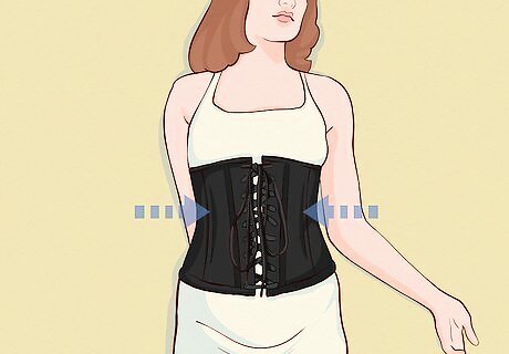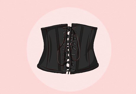 Don a corset. To put on a corset, unlace it completely. Then thread the string through the bottom pair of holes and make sure an even amount of string is on each side. Pull the corset over your head. There are many different types of corsets, and many ways to tighten yours up. If you have a plain canvas corset with no shape, you can lace it in the front. This is to your advantage. If you have a custom-made corset, or a corset with boning, you will have to lace it in the back. It will probably be helpful to have a friend lace it for you. Hold on to a doorframe or bedpost and allow your friend to lace up the back, much like you would a sneaker.