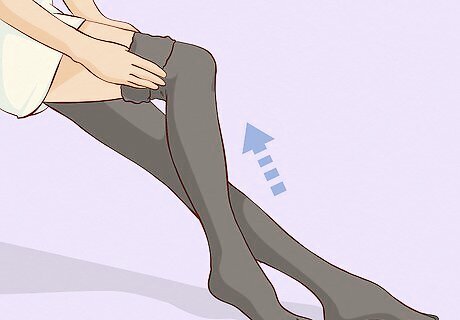 Put on your stockings. Any stockings will work, so long as they go past the knee. Modern dress stockings from any department store will suffice. It is important to maintain the height of the stocking at all times. To do this, first pull the stocking as high as it will go. Then, slide a garter up your leg until it is about one inch underneath the top of the stocking. Fold the top over the garter, and then roll the stocking and the garter down to just below your knee. This will keep your stockings stay up high all day long. Some ladies chose to put ankle socks over their stockings to avoid blistering. This is up to you.