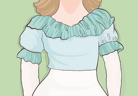 Don your blouse. Simply put it on and button it in either the front or back, depending on the style. Remember that Southern belles generally wore cotton blouses, similar to the ones often worn today, though the patterns and colors may have varied. Don't forget to always cover everything from the collarbone and wrists up.