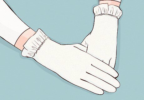 Put on gloves. There are many variations on gloves, and almost no set rules. Gloves went to the wrist, and usually had one button or no buttons. They could be silk or cotton of almost any color or pattern, so long as it complimented a lady's dress. Some gloves had fingers, while others did not. Still other gloves were made of "fishnet". Some fishnet gloves have fingers, some do not. All of these gloves should be readily available to you. Department stores should carry plain silk gloves in the winter if this is the easiest buy for you.