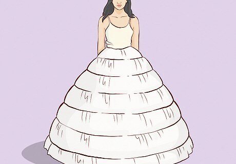 Tie on your hoop skirt. A hoop skirt may have anywhere from three to eight bones (plastic hoops running through the fabric), though the typical one Southern belles would have worn would have had six. There are many variations on the hoop. Some hoops are covered in ruffles or tulle, while others only have thin cotton stretched tightly between the bones. Tie your hoop as tightly as possible in the front or back, and pin it to your chemise to keep it from sliding.