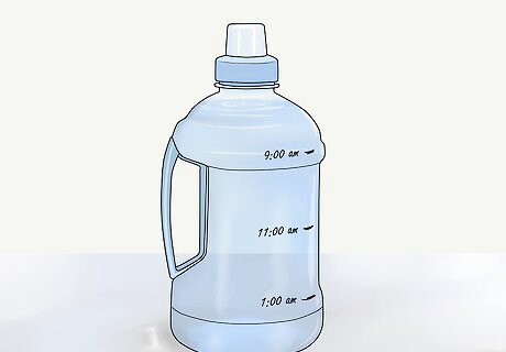 Draw lines on your water bottle with corresponding times. If you have a large water bottle and don’t mind marking on it, use a permanent marker to draw a few lines around the bottle as reminders. Then, write times that correspond to the lines, such as 9:00 am 1/4 of the way down the bottle, 11:00am halfway down the bottle, and 1:00pm 3/4 of the way down the bottle. If you need to refill your water bottle more than once per day, then you could write additional times along these lines, such as 10:00 am/2:00pm at the halfway mark.