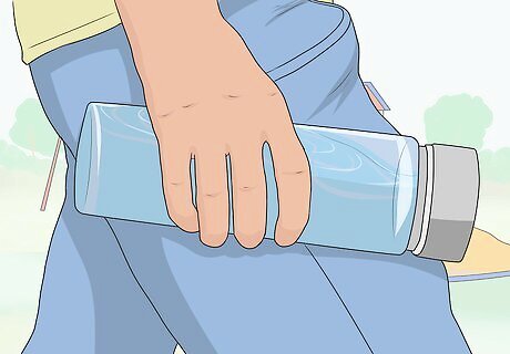 Don't forget to carry a water bottle with you wherever you go. Always having water on hand makes it easier to remember to drink it. Slip a reusable water bottle into your purse, gym bag, backpack, desk drawer, or car, and refill it regularly. Avoid chugging or taking big gulps from your water bottle. Instead, take small sips throughout the day. Water bottles come in all sizes, styles, and materials. You can even get water bottles with built-in water filters so the water will taste better.