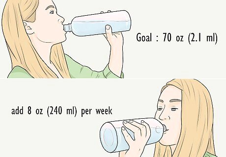 Increase your water intake slowly to avoid unpleasant side effects. Increasing your water intake too quickly may mean you’ll have to pee more often than usual, which can be inconvenient and uncomfortable. Only drink an additional 8 fl oz (240 mL) per week as you work towards your goal. For example, if your goal is to drink 70 fl oz (2,100 mL) per week and you’re currently drinking 48 fl oz (1,400 mL) per week, start by upping your intake to 56 fl oz (1,700 mL) per week, then 64 fl oz (1,900 mL) per week the week after that, and then 70 fl oz (2,100 mL) per week on the third week.