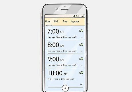 Set an alarm on your phone to remind yourself. Try setting alarms or computer reminders that tell you to drink water once per hour, or decide on a few personal “triggers” for drinking water. Triggers to sip water can be routine activities that you do all the time, such as: Making or receiving a phone call Stretching while you're at work or school Hearing someone say your name Checking your email
