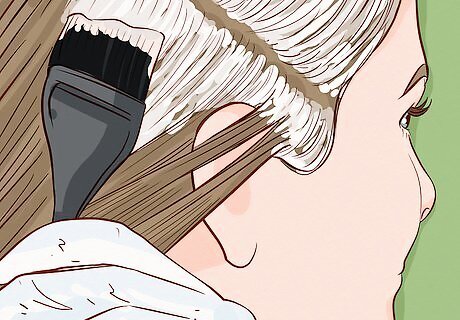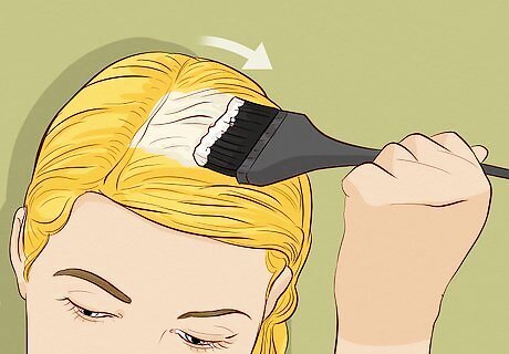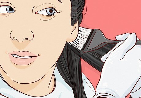 Apply the dye to your hair, starting from the roots. Again, you can do this with a clean tinting brush or with your hands. It would be even easier if you pulled your hair up, and worked in layers. Make sure that you coat your hair evenly, especially around the hairline and part, where it will be most visible. If you wish to use a tinting brush with bottled dye, apply the dye to your hair first, then spread it with the brush. Apply some petroleum jelly to your hairline before applying the dye. It'll help guard your skin against stains.