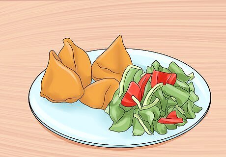 Consider balancing a samosa with a healthier option, such as a salad. Samosas are best enjoyed in moderation, for they are filled with high fats and refined sugars. Share your uneaten samosas. There's no better treat for friends and family. You can also buy or cook samosas in bulk and freeze them in foil for up to six months. Thaw in the fridge before you’re ready to eat.