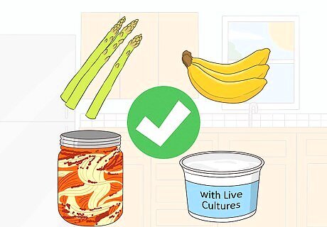 Increase your consumption of probiotics and prebiotics. Prebiotics are carbohydrates that probiotics feed off of but your body is unable to digest. Probiotics are healthy gut bacteria that strengthen your immune system. Prebiotics, such as beta-glucan and inulin, are in foods like asparagus, barley, oats, bananas, and onions. You can find probiotics in fermented foods, such as Greek yogurt, kefir, sauerkraut, and kimchi. Find a yogurt with a label that includes "live cultures," which are the probiotics.