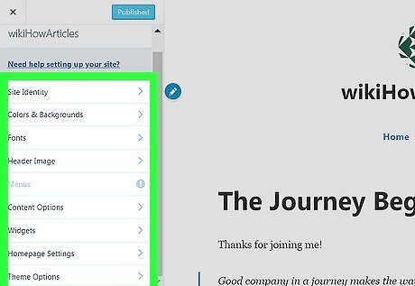 Change the look of your blog. The left column contains options for customizing your blog's homepage. After making changes in one category, tap the left-arrow at the top of the column to return to the list. Here’s what the options do: Colors & Backgrounds: Contains various color schemes and palettes, as well as the option to upload a background image. Fonts: Lets you choose the typeface of headers and blog posts on the page. Header image: Select this option to upload or select a new image for the top of the home page. Menus: The options here will vary by theme, but you can usually create or edit menus in one or more locations on the page. Widgets: Lets you add special tools for different purposes in various areas of the page. Home Page: Lets you choose whether to show a list of your blog posts or a single static page as your blog’s home page. Theme: You can select one of WordPress’ free themes or pay for one with additional features.