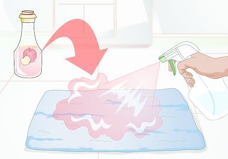 Use apple cider vinegar. Another great way to address dog smell in your home is by using apple cider vinegar to eliminate the smell in problem areas. Make a mixture using one part apple cider vinegar and three parts water, then spray the mixture on the area that smells the worst – fabric, carpet, etc. Blot as much of it up with a rag or an old towel and let the rest dry on the carpet. This method is especially useful for covering up the smell of dog urine.