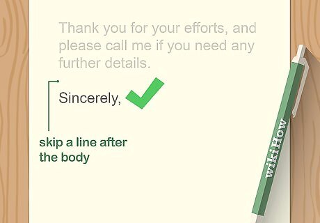 Skip a line after the body, then type the closing. Align the closing to the left and include a comma after it. If the closing is 2 words, like “Yours truly,” capitalize the first word only. Be sure to skip a line so there’s a blank space between the body’s last sentence and the closing.