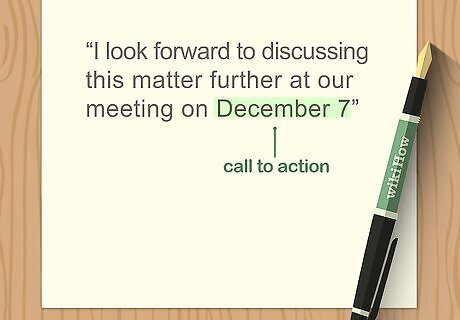 Include a specific call to action if the letter is results-oriented. If you’re making a request, filing a complaint, or otherwise writing to yield a result, close with a single strong sentence to make your wishes clear. Ending with a polite, specific call to action can add a sense of urgency or importance if you need the reader to do something for you. Examples include: “I look forward to discussing this matter further at our meeting on December 7.” “Please update me on the situation by the end of the week.” “Thank you for your efforts, and please call me if you need any further details.”
