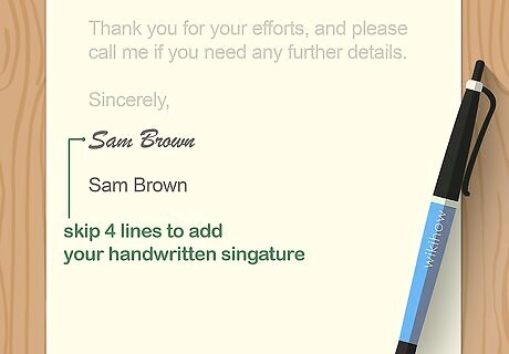 Add your typed signature 4 lines below the closing. Your handwritten or electronic signature will go in the 4 blank lines under the closing. After skipping the lines, type your name to match your handwritten signature. For instance, include your middle initial if you use it in your handwritten signature. If you’d like, include degrees or professional ratings, such as Ph.D. or CPA, after your typed signature. Type your name followed by a comma, then add the degree or certification.