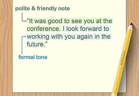 End on a polite, friendly note, but keep your tone formal. Unless your writing a complaint or reprimand, the last paragraph's tone should be friendly or appreciative. Even if you’re writing a formal complaint letter, you should still be polite and optimistic. If you’re writing to someone you know, you could end with a personal note, but don't get too informal. For instance, write, “It was good to see you at the conference. I look forward to working with you again in the future.” If you’re writing a complaint, close with, “I hope we can resolve this situation and continue doing business together in the future.”Tip: Keep your tone consistent throughout your letter. Suppose you’re informing your landlord of repairs they need to make. You wouldn’t end the body with a bubbly pleasantry or use a closing like “Warmest wishes” or “Cheers.”