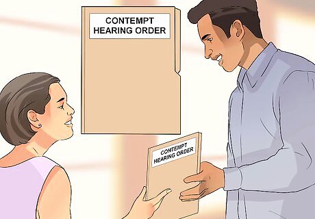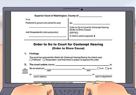 Obtain court forms. Go to the court and get the forms for a contempt hearing. There will probably be several, such as a “motion” and a “contempt hearing order.” Ask the court clerk for everything. You can also look online. Many courts post their forms on their website, which makes access easy.