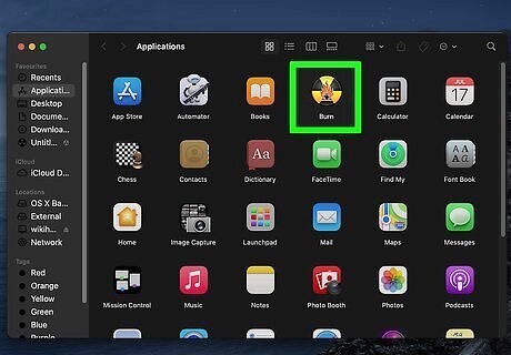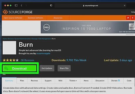Download and install Burn. This program is several years old, but it's free and it still works. Go to http://burn-osx.sourceforge.net/Pages/English/home.html in your browser, click Download Burn in the lower-right side of the page, and then do the following: Open the Burn ZIP folder by double-clicking it. Click and drag the Burn app icon into the Applications folder. Double-click the Burn app icon. Verify the download.