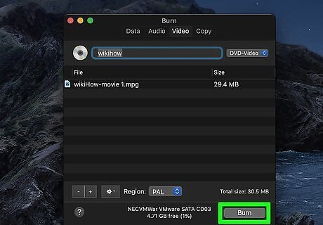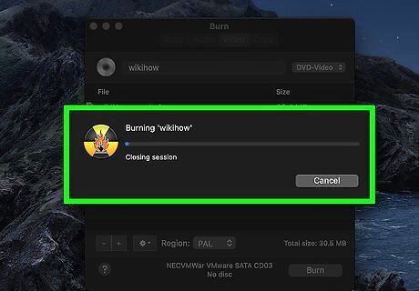 Click Burn. It's a blue button in the bottom-right corner of the window. The video will begin burning onto the DVD. Once the burn is complete, you'll hear a chime, and the DVD's icon will disappear from the desktop.