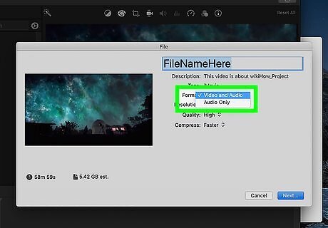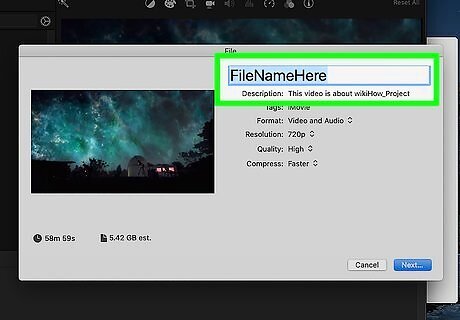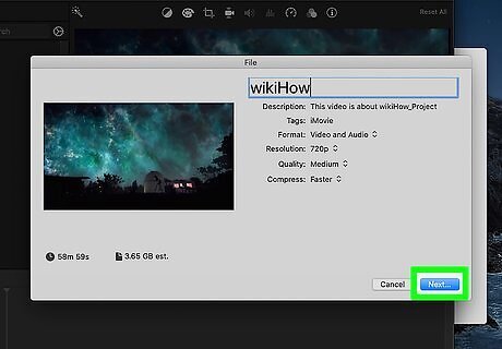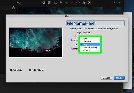 Edit the quality options if necessary. You can change the following options for your video: Resolution - 1080p is the standard for HD, but you can select a different resolution to cut down on your file's size. Quality - High should be sufficient for most places, but clicking the current quality option will prompt a drop-down menu with different quality options. Compress - Better Quality should be selected here, but you can select Faster if you're in a hurry to export.