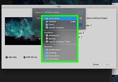 Select a save location. Click the "Where" drop-down box, then click a folder in which you want to save the exported movie file (e.g., Desktop) and click Save. Your movie will begin exporting into a file.