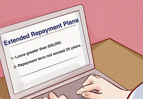 Choose an extended term repayment plan. Check the Federal Student Aid Repayment Estimator to calculate how different repayment plans will impact your overall repayment term and amount of interest paid. Be sure to read all the terms and conditions of the repayment plans you’re considering. Once you’ve done all your research, decide which plan you would like to switch to.