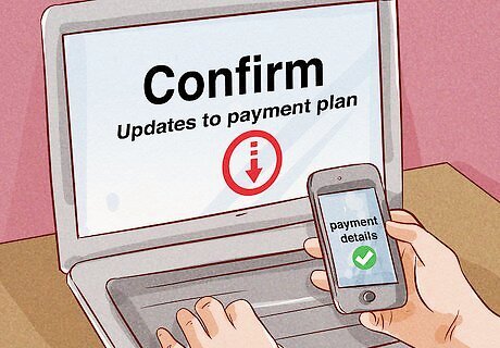 Confirm the updates to your repayment plan. You should receive a notification within your account confirming the details of your updated repayment plan. If not, call back and request a confirmation in writing. Check the upcoming payment details in your account, and make sure the bill amount is what you expected. While your change is processing, your upcoming bill may not reflect the changes. The new, lower payment may appear in a few week’s time or the following month. If you require an immediate adjustment, communicate this to your loan servicer.