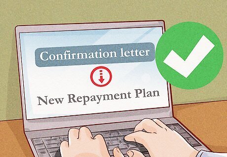 Confirm the details of your new repayment plan. Your private loan servicer should send you a confirmation letter, documenting the update itself and the new terms of your repayment plan. If you don’t receive anything, call back and request this information in writing. Take a look at the upcoming payment details in your account, and make sure the bill amount reflects your new plan. Your account may not reflect the changes immediately. It may take a few weeks or a month for your lower payment to become effective. If you aren’t able to make your next payment, explain this to your loan servicer and ask about your options for immediate assistance.
