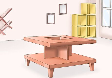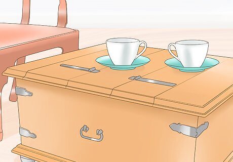 Repurpose items. You might find interesting pieces that can be used for a different purpose than intended. These pieces can be a focal point for your room if you choose. Transform your old furniture, or keep an eye out for things that can become tables, wall hangings, or accent pieces. You might: Use an old luggage trunk as a coffee table Hang antique dinner plates on the wall Drape an old quilt over a chair Frame vintage fashion magazines images Make shelves out of old wooden planks Position a TV on a painted crate
