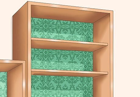 Wallpaper the inside of your bookcase. An easy way to add a customized twist to an old bookcase is to wallpaper the back of the shelves. Find a wallpaper that matches your theme or color scheme. Cut the wallpaper to size of the backing of each shelf. Paste it on using wallpaper paste. Let it dry before you put items back on the shelves. If you are using the bookcase to display decorative objects like vases or figurines, you might want to choose a solid color for the wallpaper, so that more attention is drawn to your collection. If you are just using the shelves for books, you can choose a bold pattern, such as chevron stripes, polka dots, or a floral design. This will make the shelves an accent piece in their own right.