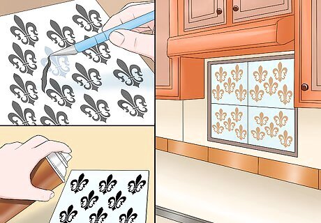 Paint your own tile backsplash. Small ceramic tiles are great for decorating the backsplash of kitchens or bathrooms, but decorated tiles are expensive. Plain white ceramic tiles, on the other hand, can be cheap. With a little time and effort, you can turn tiles into something stunning and extravagant. Find a stencil of a design you like, such as a fleur-de-lis or a bird. Press the stencil down on the tile, and paint over the design. Let the tile dry, and you have an easy, beautiful tile. You can then adhere it to the wall using tile mastic. Good places for painted tile backsplashes include underneath cabinets or above a countertop. Do not paint the tiles on your floor or along your shower or bath. Too much water damage can ruin the paint.