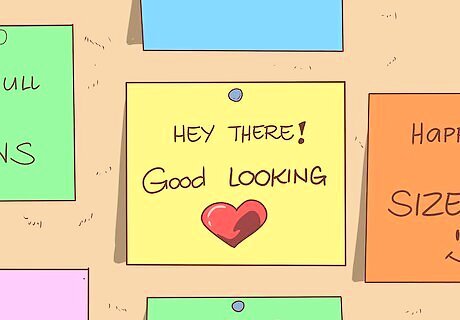 Leave yourself little love notes. Spread the good vibes. Sometimes, all you need is a gentle reminder that you are beautiful, and that you are enough. Cut out several pieces of paper, a dozen or more. Write down positive statements to tape to your mirror or hide in unusual places so you can reap the benefits of these love notes later. Your personal love notes can say things like: Hey, there, good-looking! Happiness isn't size-specific. Love the skin you're in. Beyoutiful!