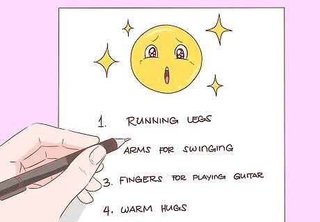 Write down all the awesome things your body helps you to do. Human bodies are amazing treasures with infinite uses, abilities, and surprises. Your body does so much for you on a daily basis. Take a moment to write a list of all the incredible functions that you gratefully notice about your body. Perhaps you can use your legs to run a 5k, your fingers to deftly strum the guitar, or your strong arms to swing your kids around. Rather than focusing on what you hate about your body, think about all the things you love.