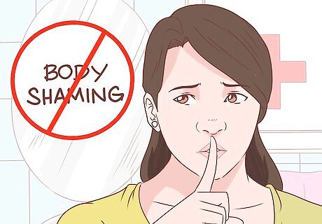 Stomp out body-shaming. Hold up a finger and "shhh" yourself and others when you put down your own body or that of others. Body-shaming occurs when a person is criticized for being fat, chastised for being skinny, called out for conforming to society's strict guidelines of beauty, judged by others in the gym, or depicted due to a body size at either extreme as being unattractive sexually. When you catch yourself or someone else taking part in these body-shaming behaviors, stop them immediately. Emphasize the significance of overall health and inner beauty rather than bashing people for not meeting the twisted standards of outer-beauty.