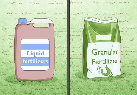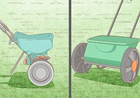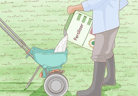 Choose a type of fertilizer. Even once you here are a lot of different types of fertilizer to choose from, and it's good to do a little research before picking one. Ask for help at your garden store if you have trouble deciding. Here are some factors to keep in mind: You can get either liquid or granular fertilizer. Liquid fertilizers work quickly, but they're also absorbed quickly so they need to be reapplied every few weeks. Granular fertilizers are sprinkled across the lawn and get absorbed more slowly. Choose between quick release and slow release granular fertilizers. Slow release fertilizers only need to be applied once or twice in a growing season. Choose between chemical or organic fertilizer. You can get fertilizer that also kills weeds, but using an organic fertilizer is better for your lawn's health in the long term.